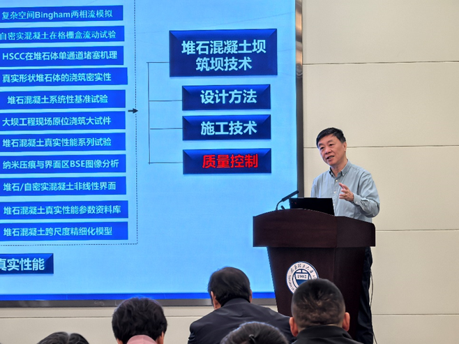 金峰教授针对其研究团队所发明的堆石混凝土技术以及数字化人工智能建造展开了详细报告。首先,他对堆石混凝土技术和高坝工程建设进行了介绍,同时也提及了该技术在国内外的应用情况;随后,金峰教授深入讲解了堆石混凝土施工信息系统,阐述了相关研究的最新进展以及关键基础问题,并指出要构建堆石混凝土的综合性能指标体系以及跨尺度精细化计算分析模型。最后,金峰教授展示了堆石混凝土坝施工信息系统 CIM4R 在工程中的应用,表明未来混凝土筑坝技术的发展方向应当是朝着环境友好、本质安全以及数智化建造的方向前进。