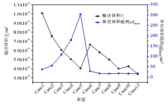 图2 不同管道车车型单位体积能耗与输送物料体积对比图(Re =175610)